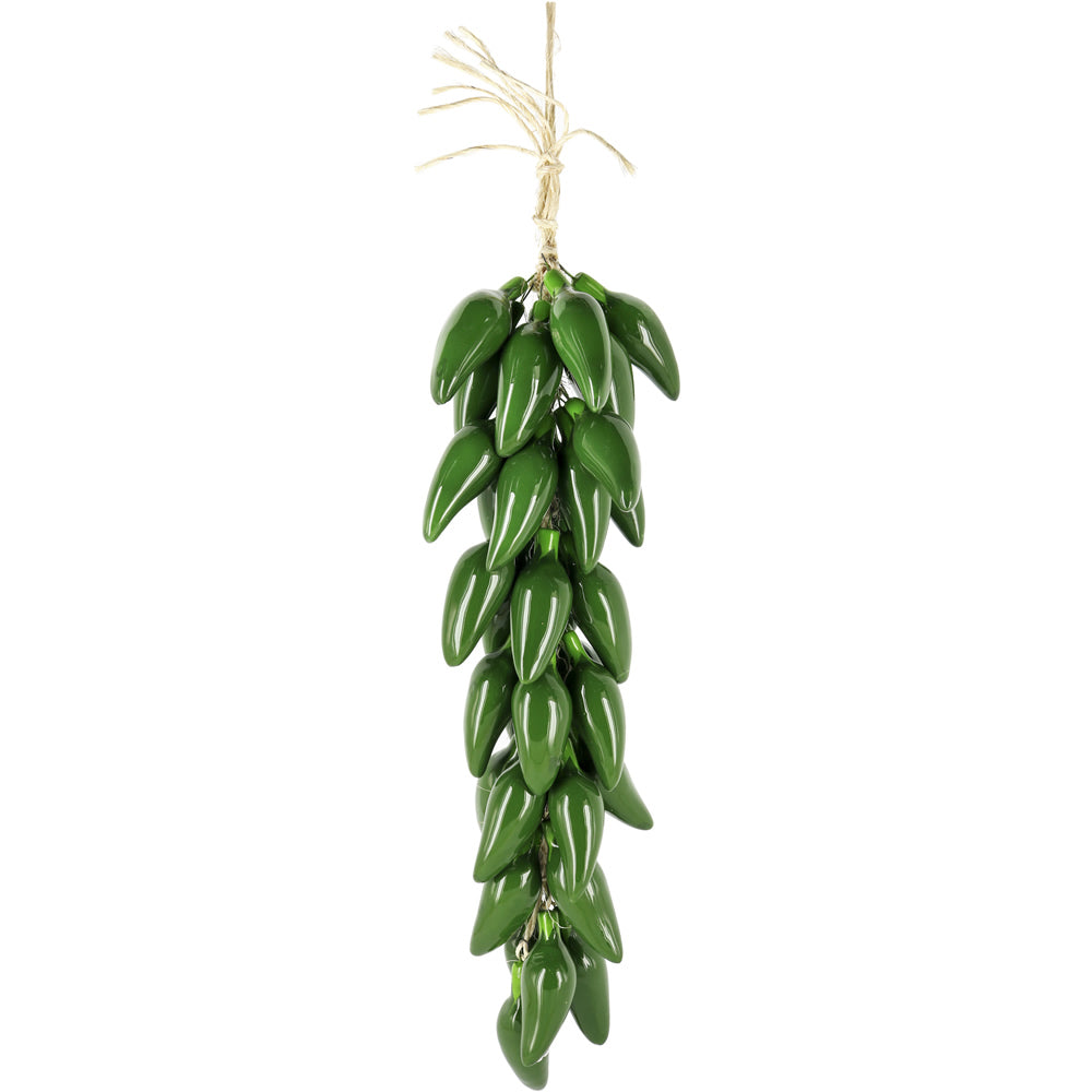 Ristra means string in Spanish. Traditionally ristras are hung near the entrance of the home symbolizing an abundant harvest. They welcome diners and bring life and joy to any kitchen. The ripening stages of the chilies are symbolized on the multicolor chiles strings, from green to red, red being the hottest. They are handmade in Mexico, and have a very realistic finish. These are of the highest quality ceramic chile ristras available in the market. These ristras bring the perfect addition to a Southwest or Mexican style decor for any home kitchen or patio.