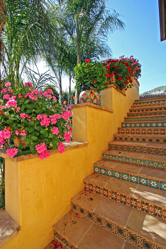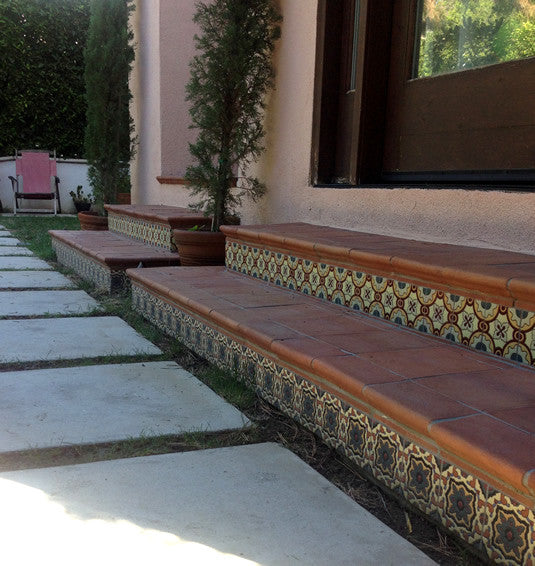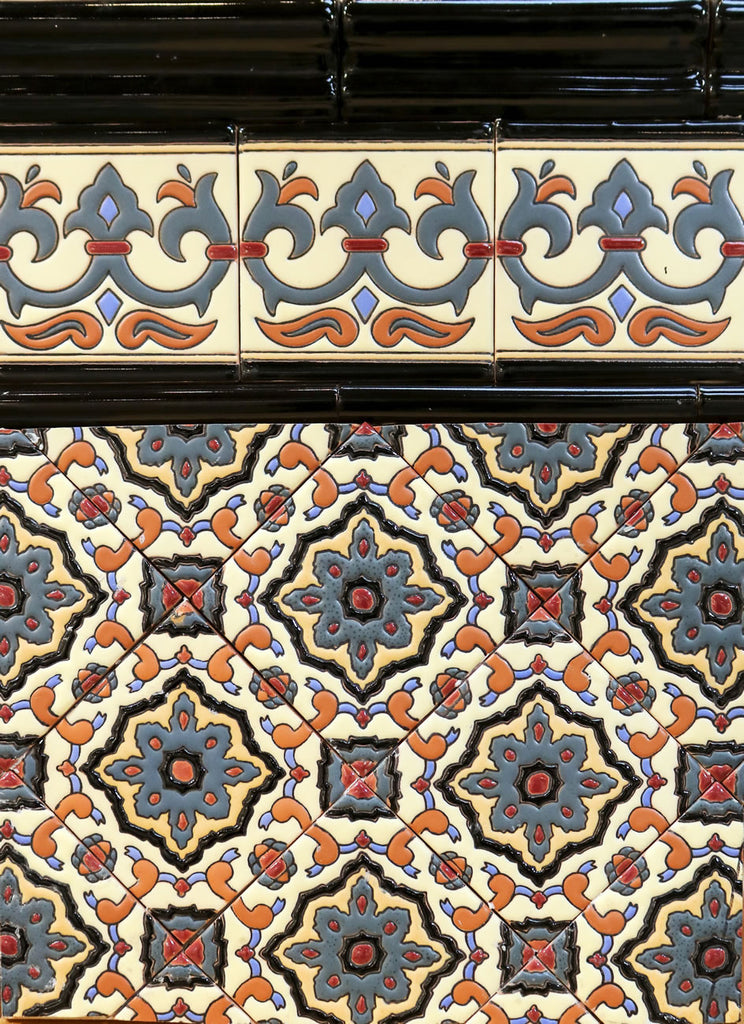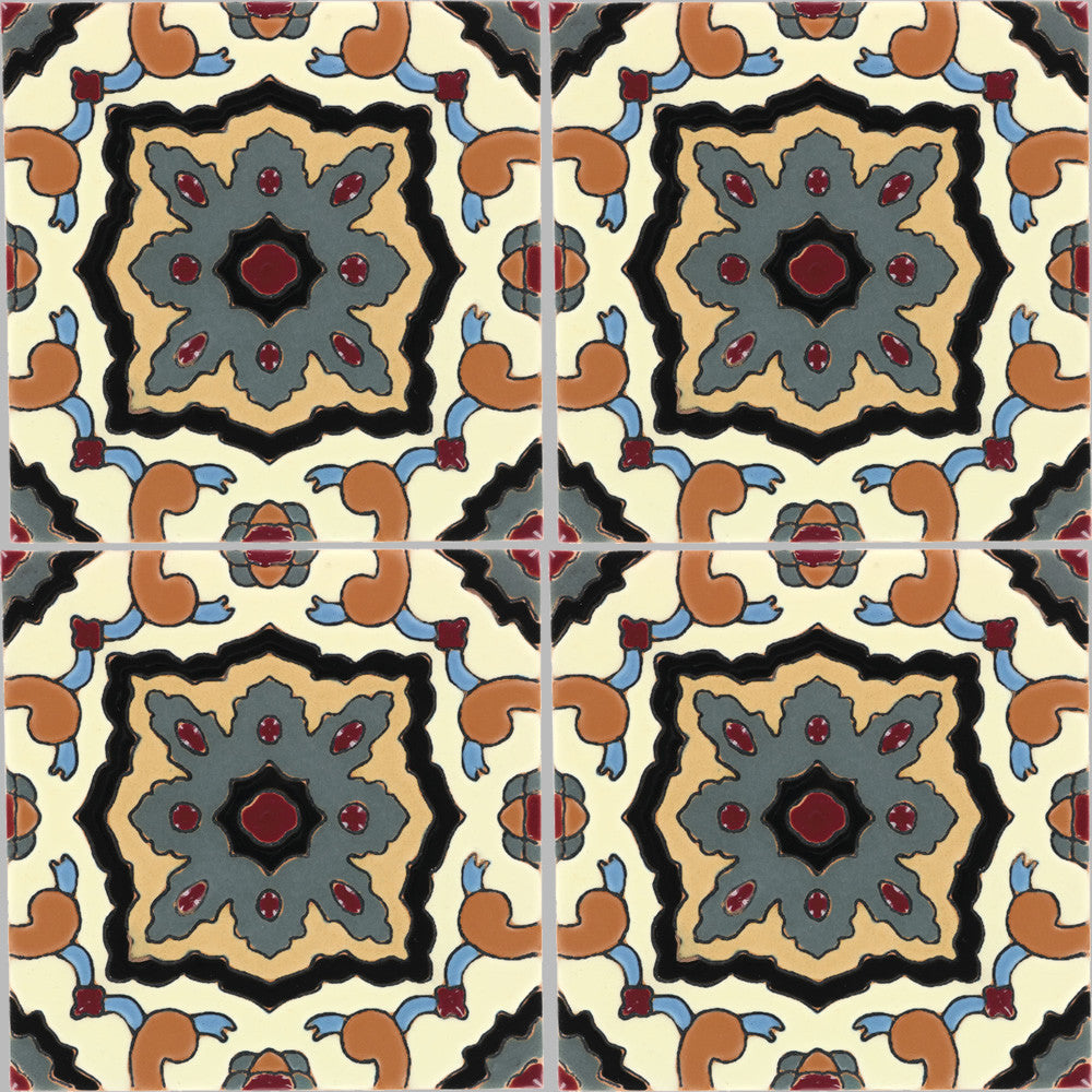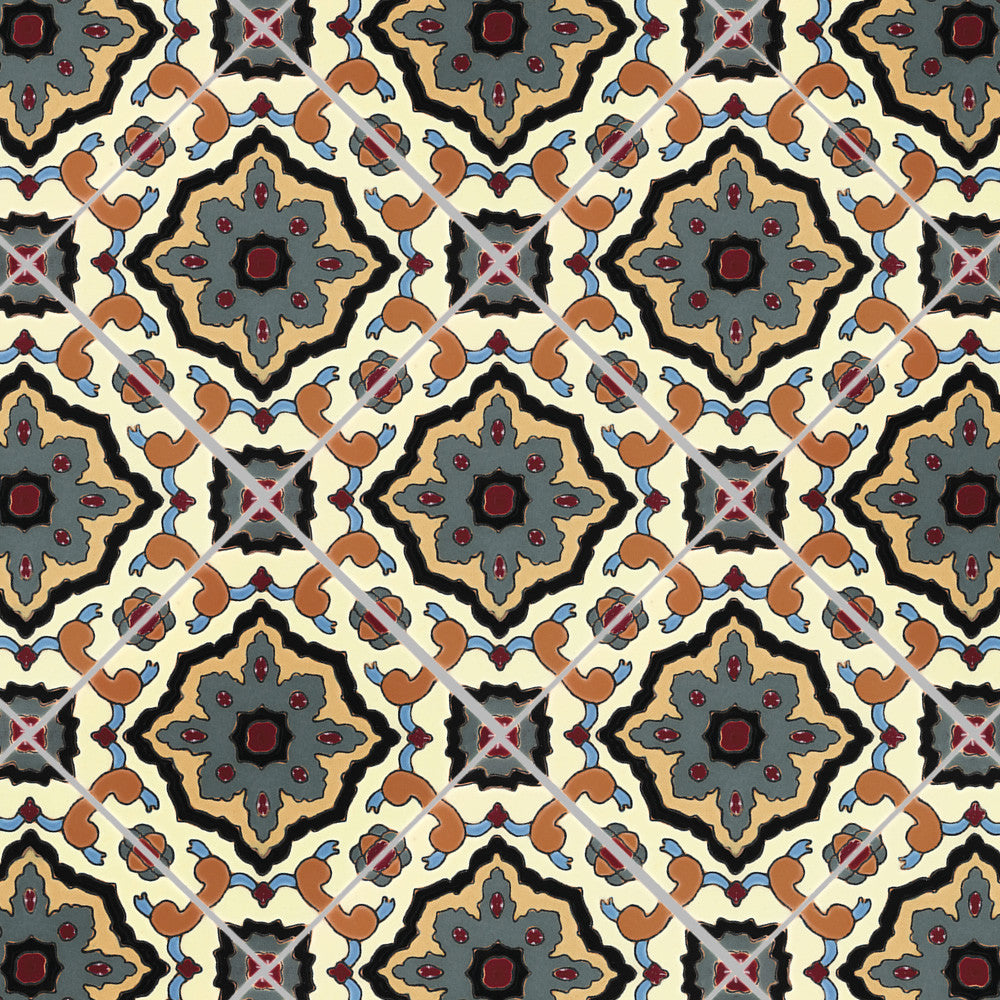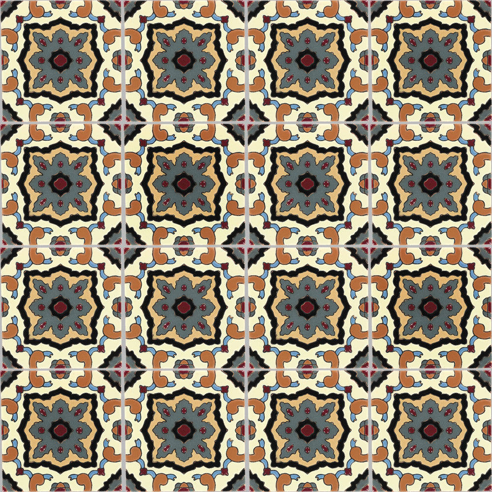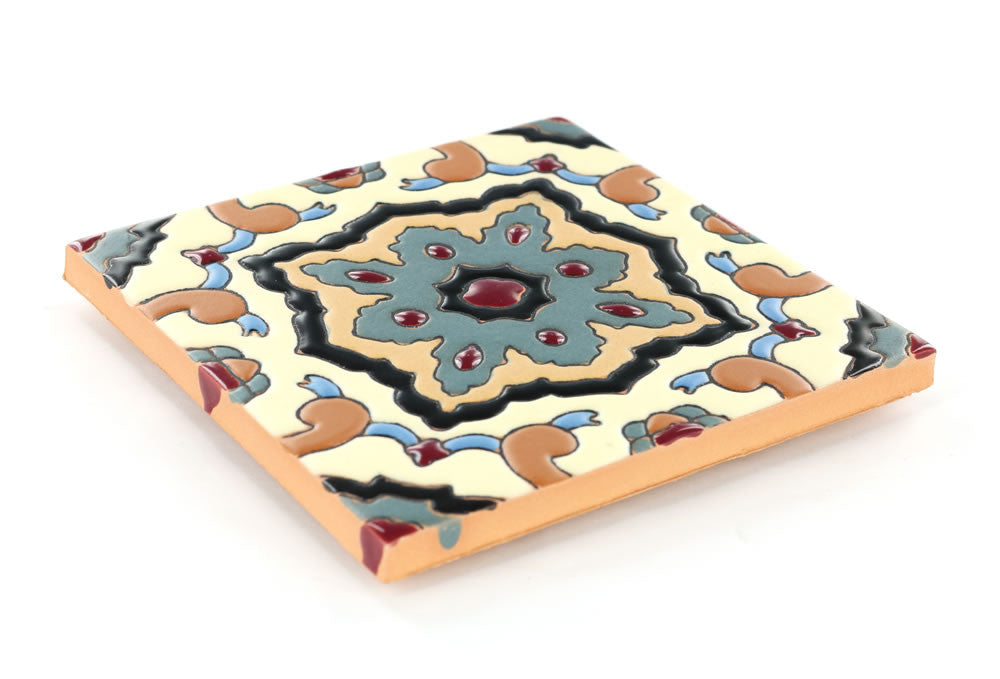 Our ceramic tile is handcrafted and decorated by hand using an ancient method called Cuerda Seca that literally translates to dry cord. This technique has been used for centuries in Spain and other Mediterranean countries. The depth and richness of the colors are obtained by painstakingly applying every single drop of glaze by hand onto a delineated design.