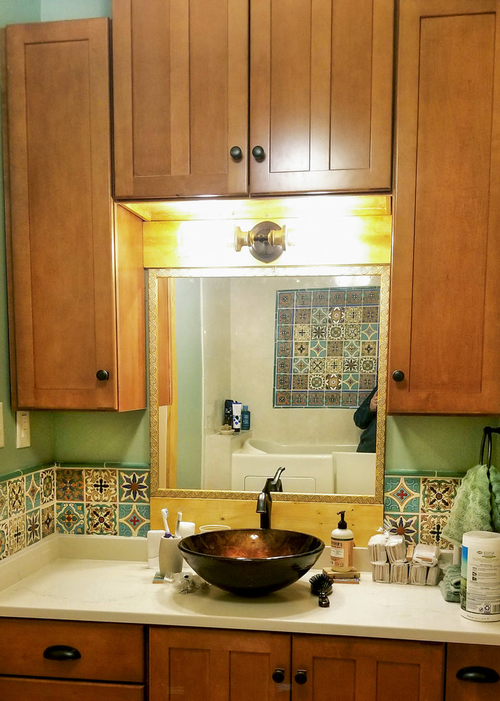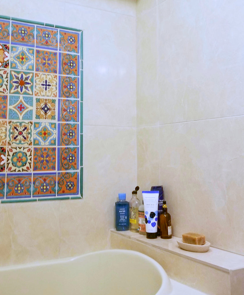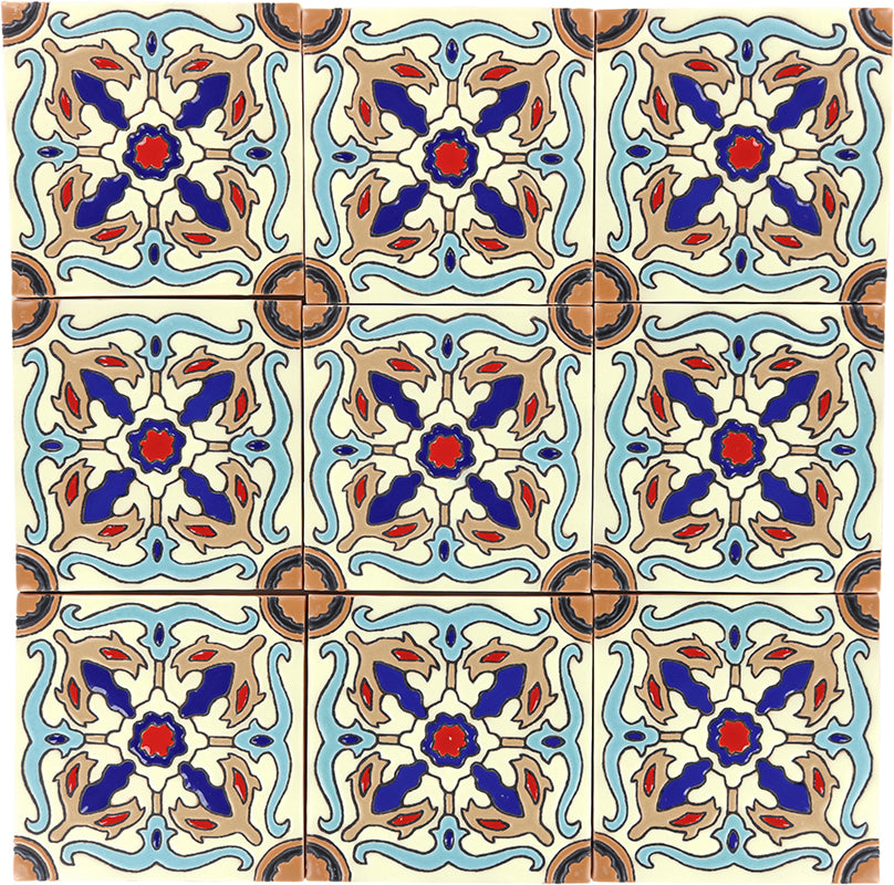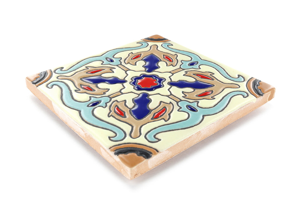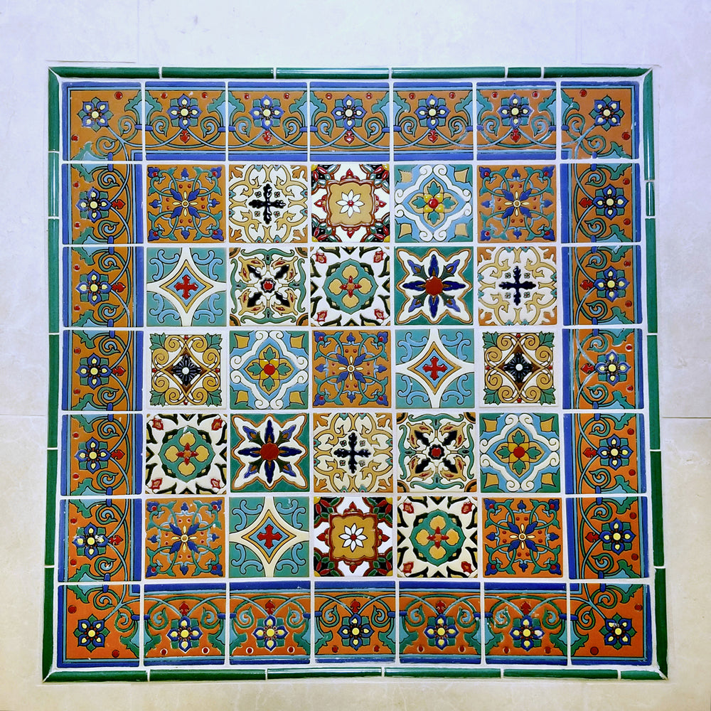 Our ceramic tile is handcrafted and decorated by hand using an ancient method called Cuerda Seca that literally translates to dry cord. This technique has been used for centuries in Spain and other Mediterranean countries. The depth and richness of the colors are obtained by painstakingly applying every single drop of glaze by hand onto a delineated design.