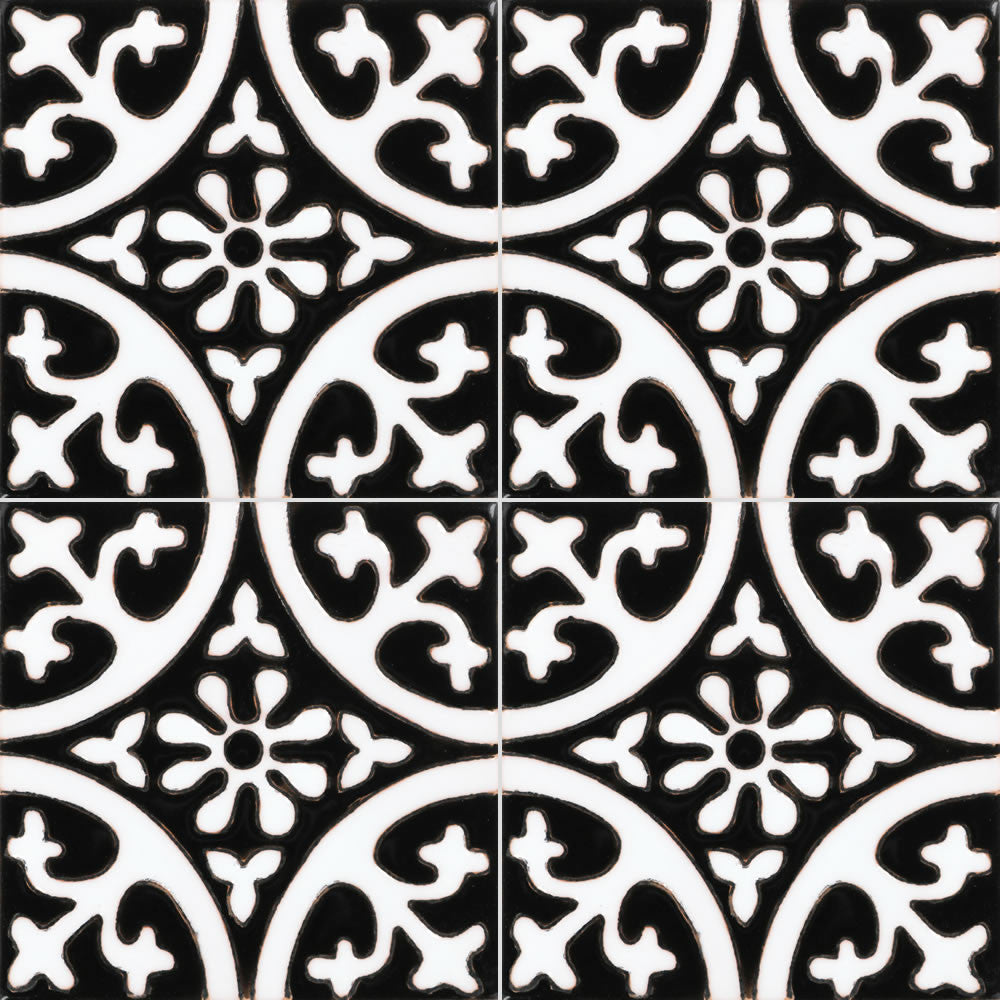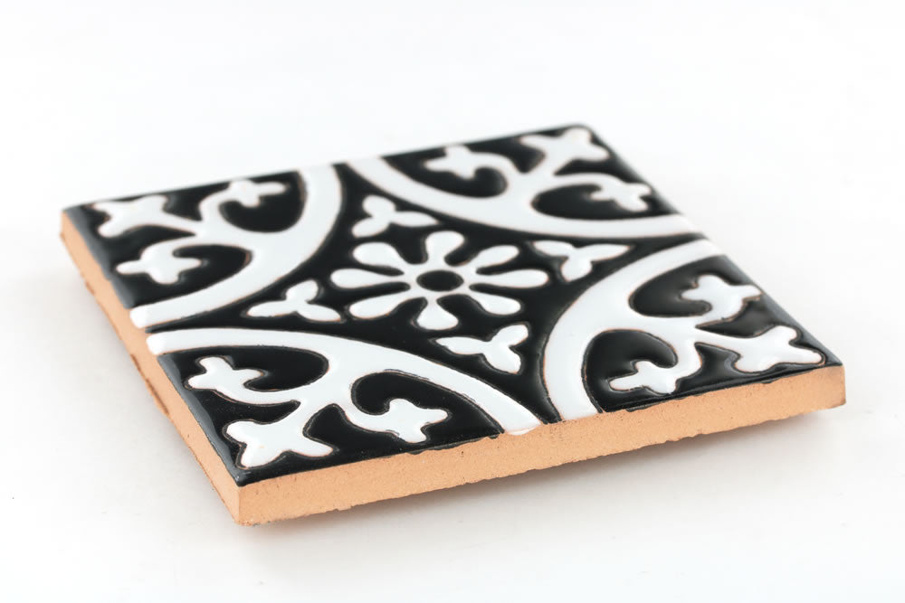 Our ceramic tile is handcrafted and decorated by hand using an ancient method called Cuerda Seca that literally translates to dry cord. This technique has been used for centuries in Spain and other Mediterranean countries. The depth and richness of the colors are obtained by painstakingly applying every single drop of glaze by hand onto a delineated design.